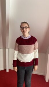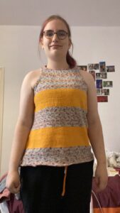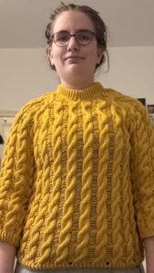 This is the Auguste Summer Pattern by Kolibri by Johanna. This was my first cable sweater to make and it was a challenge. But I did love to make it! I used yarn from the brand ‘Paintbox’. The weight is Aran and it is 100% acrylic. The size is a medium.